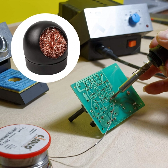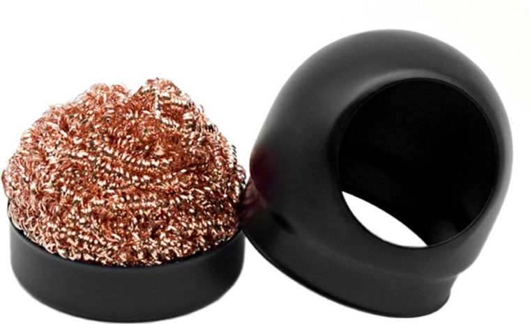 Le nettoyeur se compose de deux parties, dont la première est un matériau en laine métallique. La panne de soudage peut être essuyée sur ce matériau pour éliminer les résidus de soudure bien plus efficacement qu’avec une éponge standard. La laine métallique elle-même est fournie dans un support arrondi compact, qui aide à garantir que le nettoyeur de panne reste pratique et peu encombrant.