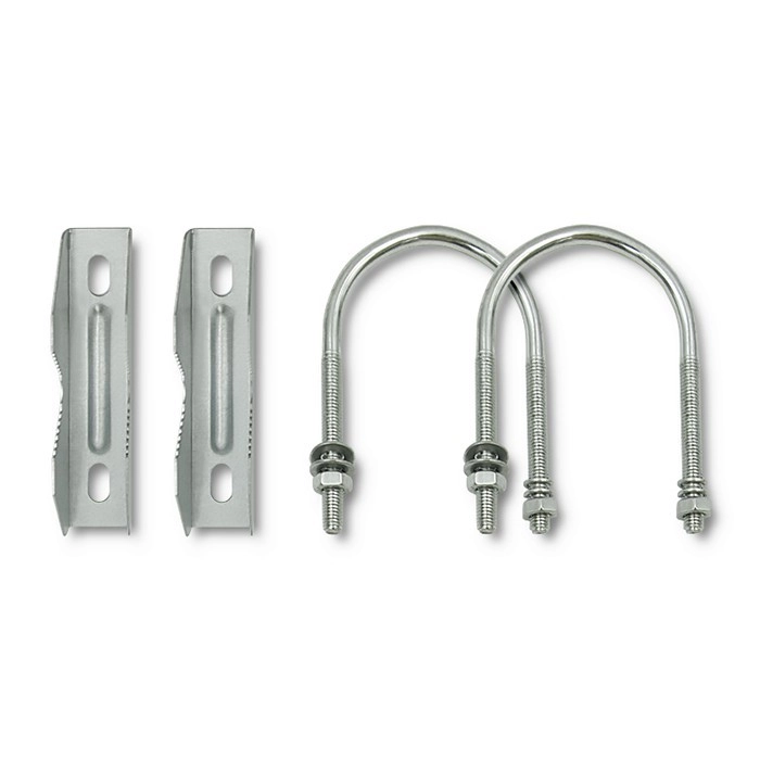 Supports et étriers en U inclus pour une fixation sécurisée sur mât ou équerre. Matériaux résistants adaptés à une utilisation prolongée en extérieur.
