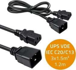 Câble d’alimentation fiable avec connecteurs IEC C20 – C13 et une longueur de 1,2 m pour une alimentation ininterrompue des serveurs, onduleurs (UPS), stations de travail et PC. Sa construction robuste avec conducteur H05VV-F 3×1,5 mm² et la conformité VDE garantissent une connexion sûre et stable aussi bien au bureau que dans des environnements IT exigeants.