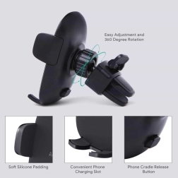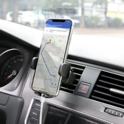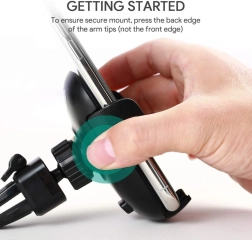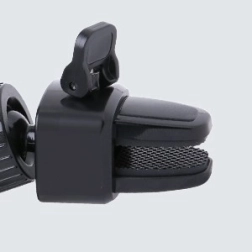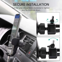 La mâchoire largement réglable avec bouton de libération rapide permet d’insérer et de retirer le téléphone en un éclair. Les surfaces de contact sont revêtues de silicone doux, qui amortit les vibrations, empêche le glissement et protège des rayures. Le mécanisme de fixation est compatible avec la plupart des aérations standard – il s’adapte aux ailettes horizontales et verticales, ainsi qu’aux grilles fines ou épaisses.