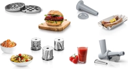 - Grande polyvalence de l’appareil. Avec cet appareil, vous pouvez non seulement hacher la viande, mais aussi couper les légumes et les fruits de différentes manières, râper les pommes de terre pour des galettes, etc.
