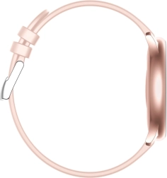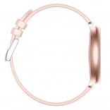 Construction minimaliste avec un boîtier fin, un aspect métallique et un bracelet rose réglable à boucle, assurant confort et style en toute occasion.