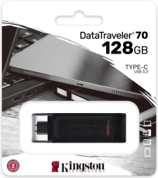 Clé USB‑C Kingston DataTraveler 70 légère et portable avec une capacité de 128 Go et une interface USB 3.2 Gen 1. Idéale pour les ordinateurs portables, tablettes et téléphones équipés d’USB‑C. Elle offre un transfert de données rapide, une sauvegarde fiable et une garantie de 5 ans avec support gratuit.