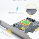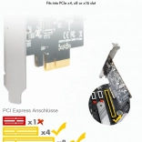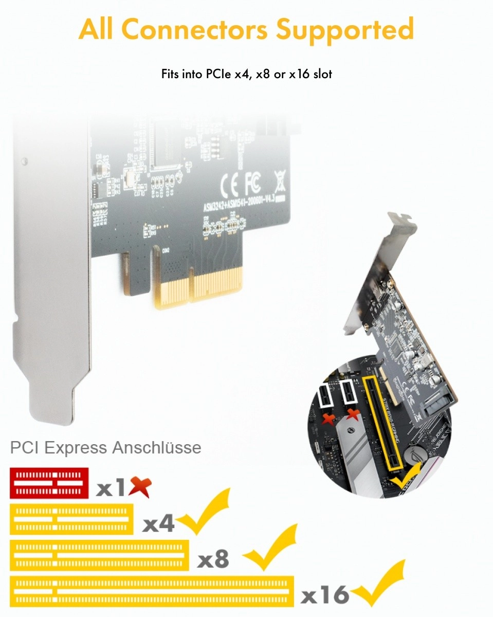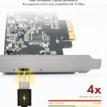 Grâce à la prise en charge du PCI Express 3.0 (x4) et à la compatibilité avec les slots x4/x8/x16, elle assure une connexion stable et rapide. Des LED bleues intégrées indiquent l’alimentation et la connexion active, vous offrant une visibilité permanente sur l’état du dispositif. La carte s’appuie sur les contrôleurs éprouvés Asmedia ASM1541 et ASM3242 pour une compatibilité et des performances maximales.