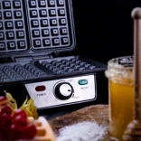 L’utilisation du gaufrier est vraiment intuitive ! Grâce au revêtement antiadhésif des plaques chauffantes, vous retirez facilement la gaufre prête, puis nettoyez l’appareil. Le thermostat maintient une température optimale pour la cuisson des gaufres, et les voyants lumineux nous indiquent quand l’appareil est prêt à l’emploi et à cuire. Grâce au réglage continu de la température, nous pouvons adapter la cuisson de 5 à 15 minutes selon les ingrédients utilisés et nos préférences gustatives. Le gaufrier permet de cuire deux grandes gaufres en même temps, ce qui garantit que chaque portion sera chaude et croustillante ! L’appareil prend très peu de place, vous pouvez donc l’emporter en vacances, et la possibilité de le ranger à la verticale permet d’économiser de l’espace dans les placards de cuisine.