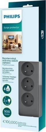 La protection contre les surtensions Philips protège les appareils sensibles des pics de tension et des fluctuations du réseau. Les quatre prises avec terre au standard CEE 7/5 (type E) conviennent à la plupart des appareils domestiques et du matériel de bureau. Le design compact gris s’intègre à tous les intérieurs.