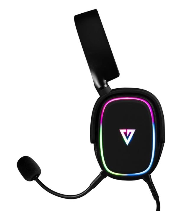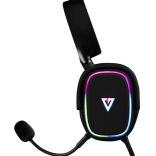 Casque de jeu MODECOM VOLCANO Prometheus léger et confortable avec transducteurs de 50 mm, carte son USB externe et prise en charge du 7.1 virtuel, offrant un son clair et équilibré, un éclairage RGB (7 couleurs + effet arc-en-ciel) et un microphone flexible détachable. Grâce aux coussinets souples en simili cuir et tissu respirant et aux commandes sur le câble, profitez de longues sessions de jeu dans un confort maximal.
