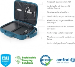 La sacoche pratique Eco Multi BASE à rabat protège de manière optimale votre ordinateur portable grâce au compartiment rembourré dédié. Les appareils de 14 à 15,6 pouces sont non seulement protégés de façon optimale, mais aussi sécurisés dans le compartiment au moyen d’une sangle de maintien. Un cadre métallique filaire assure une stabilité et une protection supplémentaires. La Eco Multi BASE, la plus légère parmi les sacoches pour ordinateur portable, garantit une mobilité flexible. Dans la poche avant pratique, vous disposez de suffisamment d’espace pour votre smartphone ou d’autres accessoires mobiles tels que câbles, stylos ou chargeurs, à avoir toujours à portée de main. Grâce aux poignées confortables, la sacoche se tient agréablement en main et peut être fixée en un instant à une valise grâce à la sangle intégrée. La sacoche peut également être transportée à l’aide de la bandoulière réglable, faisant de l’Eco Multi BASE la sacoche idéale pour les grands voyageurs qui souhaitent soutenir la réutilisation intelligente des bouteilles en PET grâce à une solution écologique pour le transport.