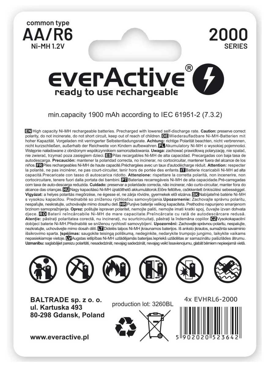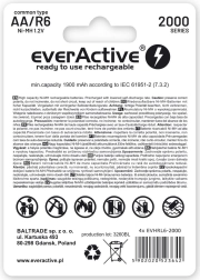 Lot de quatre piles rechargeables AA d’une capacité de 2000 mAh avec technologie prêtes à l’emploi pour une utilisation immédiate. Idéales pour les appareils photo, flashes, lampes torches et lecteurs portables. Elles offrent des performances comparables aux piles alcalines, mais peuvent être rechargées jusqu’à 1200× et gèrent mieux les courants de décharge élevés.