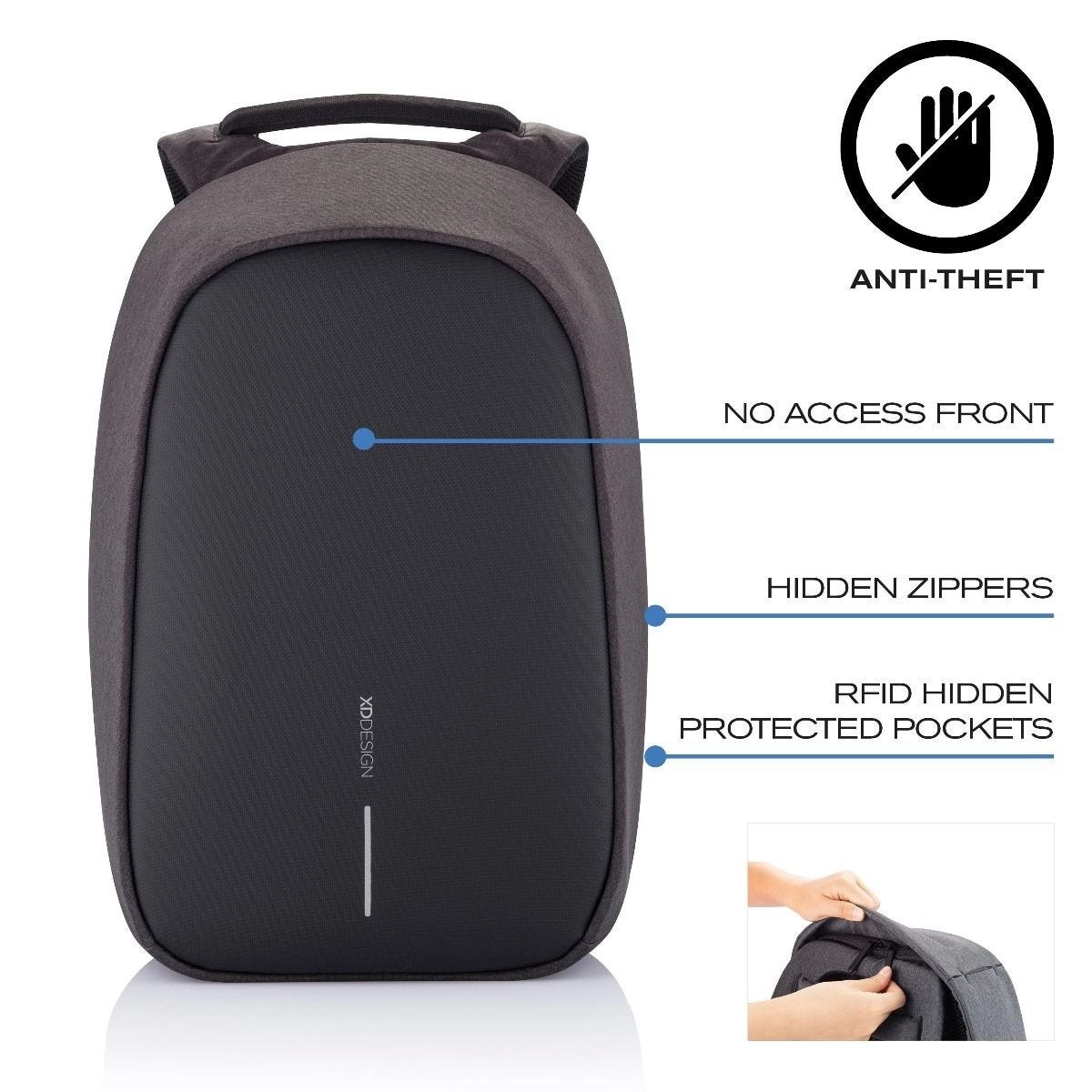 Fermetures éclair dissimulées, accès uniquement par l’arrière et poches avec protection RFID protègent vos objets de valeur des pickpockets dans les transports en commun comme à l’aéroport.