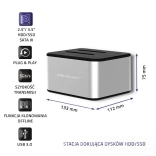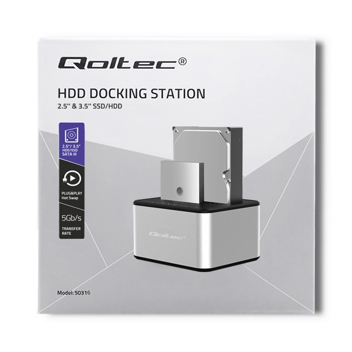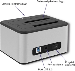 Station d’accueil universelle pour 2× HDD/SSD aux formats 2,5" et 3,5", connexion simple via USB 3.0 jusqu’à 5 Gbps et prise en charge SATA I/II/III. Permet le clonage hors ligne d’une simple pression, sans ordinateur, dispose de la fonction Plug & Play sans installation de pilotes et d’un design stable avec pieds en caoutchouc.