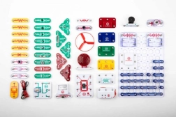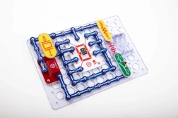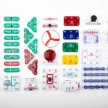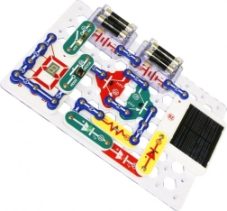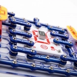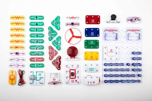 Les pièces se fixent sur la plaque de base grâce à des contacts à encliqueter. Le code couleur et les libellés des composants facilitent l’orientation, même pour les enfants dès 8 ans.