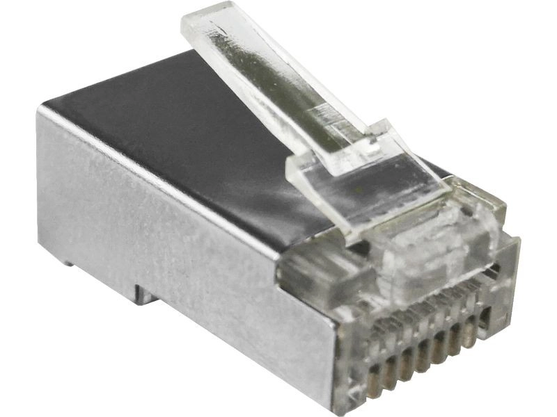Connecteur traversant universel RJ45 8P8C avec blindage STP pour câbles de catégorie Cat 5e. Grâce à sa conception traversante, il permet un montage rapide et précis, un alignement uniforme des paires et un sertissage fiable avec contrôle visuel de l’ordre des conducteurs.