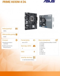 L’ASUS PRIME H610M-K D4 est conçue pour une fiabilité et une stabilité au quotidien. Elle prend en charge les processeurs Intel Core de 12e et 13e générations sur socket LGA 1700 et s’appuie sur la mémoire DDR4 éprouvée, permettant de monter facilement un PC performant et économe pour le travail, les études et le multimédia.