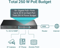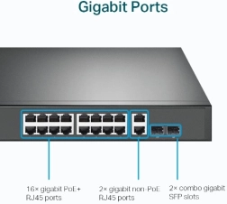 Ce switch propose 16 ports gigabit avec prise en charge PoE+, 2 ports RJ45 gigabit et 2 ports SFP combo gigabit pour une flexibilité de connexion maximale.