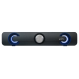 Elle possède un bouton de commande argenté central qui sert de régulateur de volume et de commutateur. Son design moderne avec éclairage bleu sur les haut-parleurs offre un aspect contemporain, sous la marque Media-Tech.