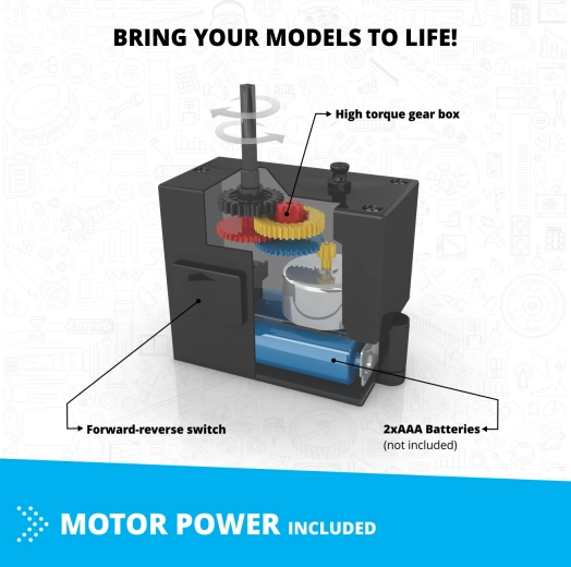 Grâce au moteur avec boîte de vitesses et couple élevé performant, vos modèles prennent vie en mouvement. Le kit soutient les principes STEM (science, technologie, ingénierie, mathématiques) et motive les enfants à expérimenter et à créer leurs propres constructions.