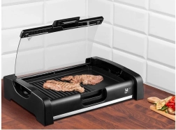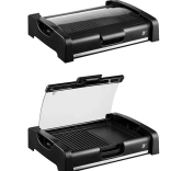La plaque de grill avec surface antiadhésive est amovible, ce qui garantit un nettoyage facile même en cas d'utilisation fréquente. Le couvercle en verre protège l'environnement des éclaboussures de graisse.