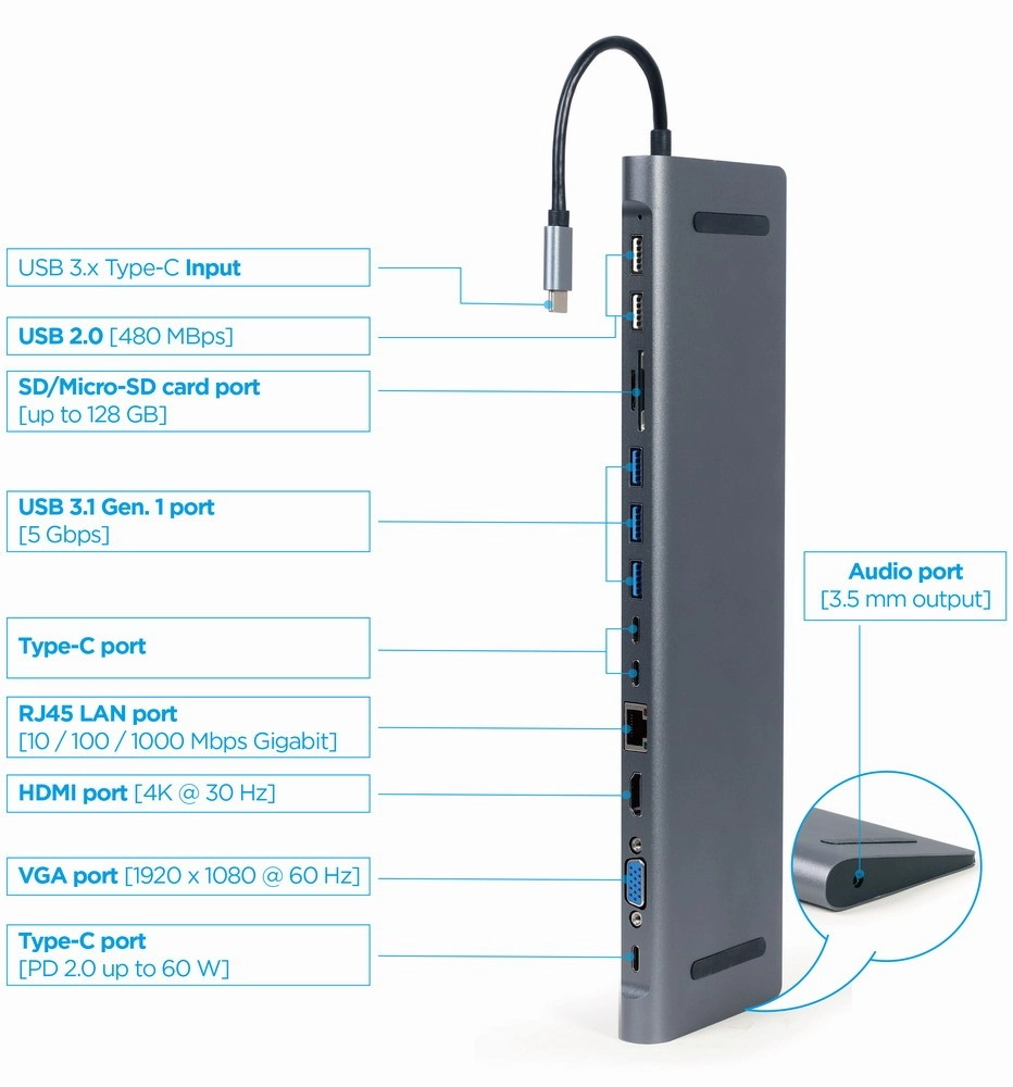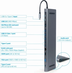 Hub USB‑C multiports 9‑en‑1 compact au design métallique élégant, il centralise toutes vos connexions en un seul appareil. Il offre HDMI 4K@30 Hz, VGA Full HD, LAN Gigabit, 3x USB 3.1 Gen 1 (5 Gb/s), 2x USB 2.0, USB‑C Power Delivery 60 W, lecteur SD/microSD et audio 3,5 mm. Simple Plug & Play sans pilotes.
