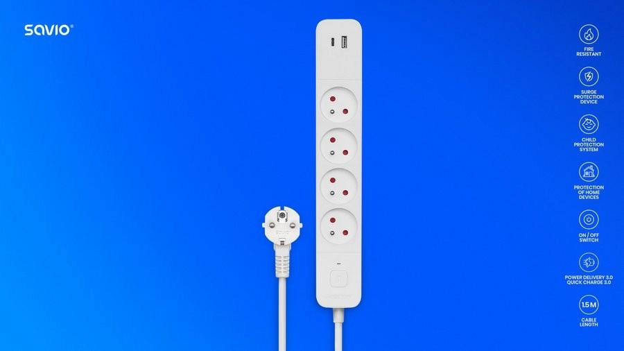 La multiprise Savio est conçue pour répondre à tous vos besoins d’alimentation et de charge. Grâce à l’interrupteur rétroéclairé intégré, vous pouvez contrôler facilement tous les appareils connectés en même temps, ce qui économise de l’énergie et améliore la sécurité.