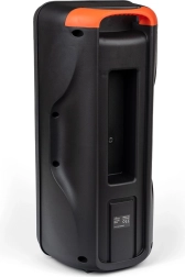 Son design réfléchi comprend un panneau avant avec des boutons de commande, des ports pour diverses connexions et une poignée pratique pour un transport facile. Le paquet inclut également un câble de charge et un câble AUX.