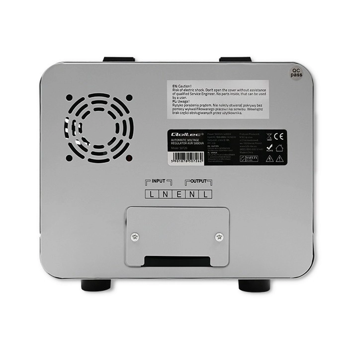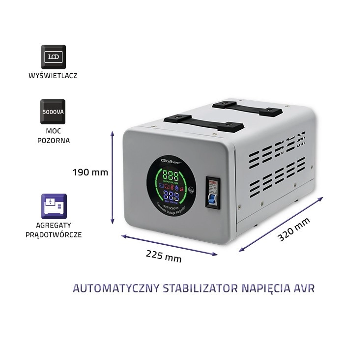 Le stabilisateur automatique de tension QOLTEC AVR 5000 VA assure une tension stable de 230 V et un fonctionnement sûr des appareils en cas de fluctuations ou d’alimentation de qualité insuffisante depuis le réseau électrique ou un groupe électrogène. Il combine protection contre les surtensions, démarrage différé et protection contre les courts-circuits, dispose d’un écran LCD pour un aperçu rapide et, grâce à ses dimensions compactes et sa poignée intégrée, il est facile à transporter.