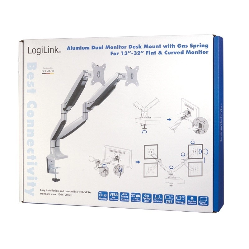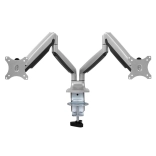 Le double bras pour moniteurs vous permet d’ajuster la hauteur, l’inclinaison et la rotation des deux écrans afin d’obtenir l’angle de vue idéal. La construction robuste assure la stabilité, tandis que la pince de table économise un espace précieux sur le plateau.