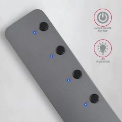 AXAGON HUE-MSA est un hub USB en aluminium robuste et élégant offrant quatre ports USB-A avec des vitesses USB 3.2 Gen 1 jusqu’à 5 Gb/s. Grâce aux interrupteurs dédiés avec témoin LED, vous déconnectez facilement les périphériques inutiles sans retirer les connecteurs. Le micro USB intégré pour l’alimentation additionnelle améliore la stabilité lors de l’utilisation de plusieurs disques externes.