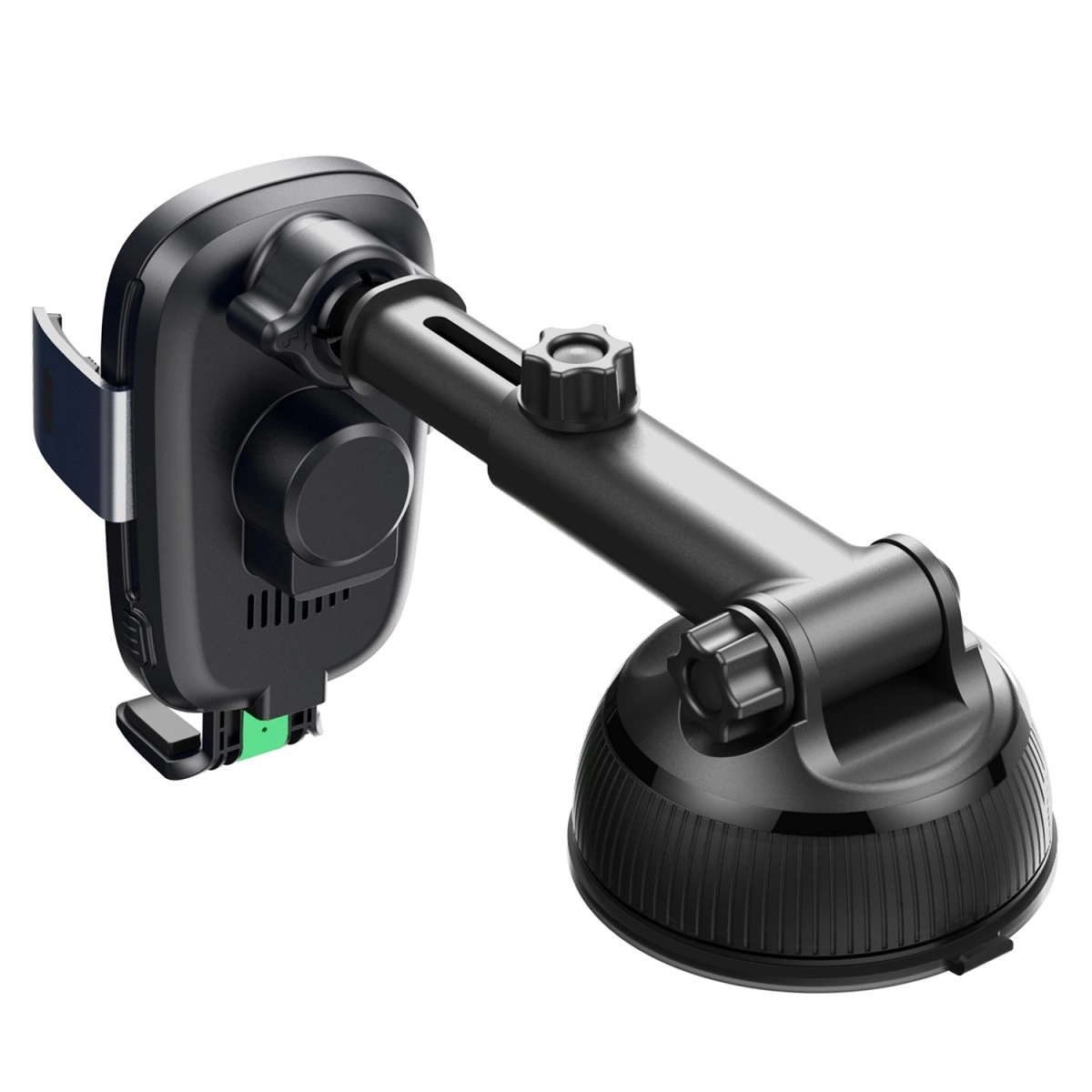 Support de voiture intelligent compatible Qi offrant une charge sans fil rapide 5/7,5/10/15 W, serrage automatique du téléphone et maintien stable même sur routes cahoteuses. Grâce à la double fixation sur pare-brise/tableau de bord ou sur la grille d’aération et à la rotule à 360°, vous réglez facilement l’angle idéal. Un condensateur intégré permet d’ouvrir les bras même après la coupure d’alimentation.