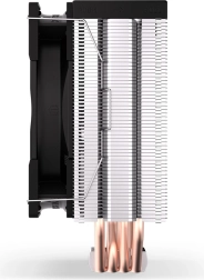 Une hauteur d’environ 15,5 cm permet l’installation dans des boîtiers plus petits. Le radiateur asymétrique avec ailetage dense et 4 caloducs maintient de basses températures même en charge.