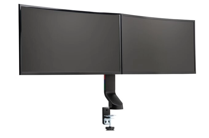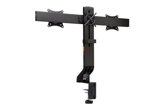 Le support permet de monter deux moniteurs côte à côte, ce qui économise considérablement de la place sur le bureau.