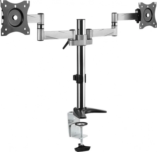 Le support de bureau pour deux moniteurs 13–27 est un choix idéal pour des configurations de travail et de jeu ergonomiques. Il offre une stabilité solide, un réglage fluide de la position et une capacité de charge maximale de 16 kg. Grâce à la pince de bureau, il économise de la place sur le bureau et assure une fixation sécurisée.