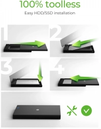 L’installation des disques est 100 % sans outils : il suffit d’ouvrir le couvercle, d’insérer le disque, de refermer et vous pouvez commencer à l’utiliser. Le boîtier prend en charge les disques 2,5 pouces SATA I/II/III avec une hauteur maximale de 9,5 mm, ce qui garantit une large compatibilité.