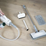 La riche dotation en accessoires permet un nettoyage ciblé des sols, joints, textiles d’ameublement, appareils de cuisine et fenêtres. Commande simple via un bouton unique, réservoir d’eau de 360 ml et protection contre la marche sans eau pour un fonctionnement sûr et confortable sans produits chimiques.