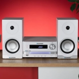 Vous disposez aussi d’une horloge avec alarme – réveil via radio, CD/USB ou buzzer. La télécommande facilite le contrôle, tandis que la puissance de 15 W RMS (max. 45 W) et la paire de haut-parleurs ouverts offrent un son étonnamment ample dans chaque pièce.