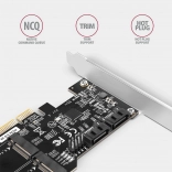 Grâce à l’interface PCI‑Express 3.0 x2, vous bénéficiez d’une bande passante suffisante jusqu’à 4 Go/s pour des transferts de données fluides. La carte prend en charge le Hot‑Plug, le NCQ, le TRIM ainsi que le Port Multiplier (Command Based Switching), et permet le démarrage depuis les disques connectés (BIOS/UEFI). Quatre LED d’activité et un header pour connecter les LED du boîtier facilitent le contrôle du fonctionnement.