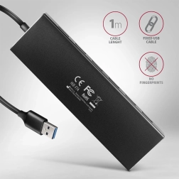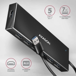 AXAGON HUE-F7A est un hub au design fin en aluminium assurant une haute résistance mécanique et empêchant les empreintes digitales. Le hub offre un port USB-A unique à l'avant pour une connexion facile de plus grands appareils.