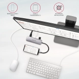 Ce hub propose trois ports USB avec connecteurs USB‑A standard. Il permet la prise en charge permanente de plusieurs disques externes. Grâce à l’interface USB 3.2 Gen 1, le transfert de données atteint jusqu’à 5 Gb/s. Le hub offre également la charge des téléphones et tablettes jusqu’à 1,5 A / 5 V.