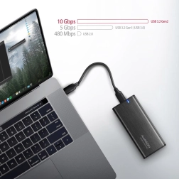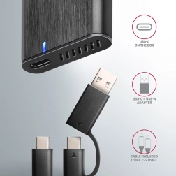 Le boîtier AXAGON est équipé d’un connecteur USB‑C moderne pour une connexion fiable et est fourni avec un câble USB‑C -> USB‑C ainsi qu’un adaptateur USB‑C -> USB‑A. Vous pouvez ainsi le connecter facilement à un ordinateur portable, un PC ou même à un appareil mobile.