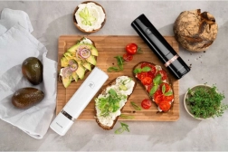 Le moteur puissant, alimenté par une batterie lithium‑ion rechargeable, assure des performances stables et une longue autonomie entre deux charges. L’éclairage LED intégré illumine le plat en préparation, tandis que la fenêtre transparente permet de vérifier aisément les réserves. Le design minimaliste signé par le duo Matteo Thun & Antonio Rodriguez s’intègre parfaitement aux cuisines modernes.