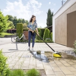 Grâce à la réglage de la distance des buses, vous adaptez aisément la puissance au support – de la pierre et du béton aux terrasses en bois. Le jet d’eau crée en outre un effet de « coussin » qui fait légèrement flotter l’accessoire et assure une maniabilité aisée. La poignée ergonomique permet de nettoyer confortablement aussi les surfaces verticales, par exemple les portes de garage ou les façades.