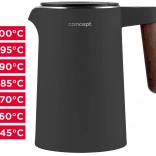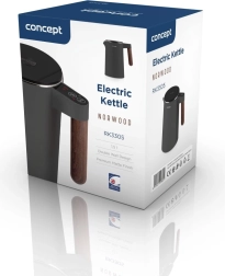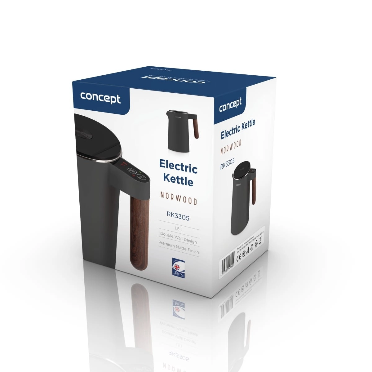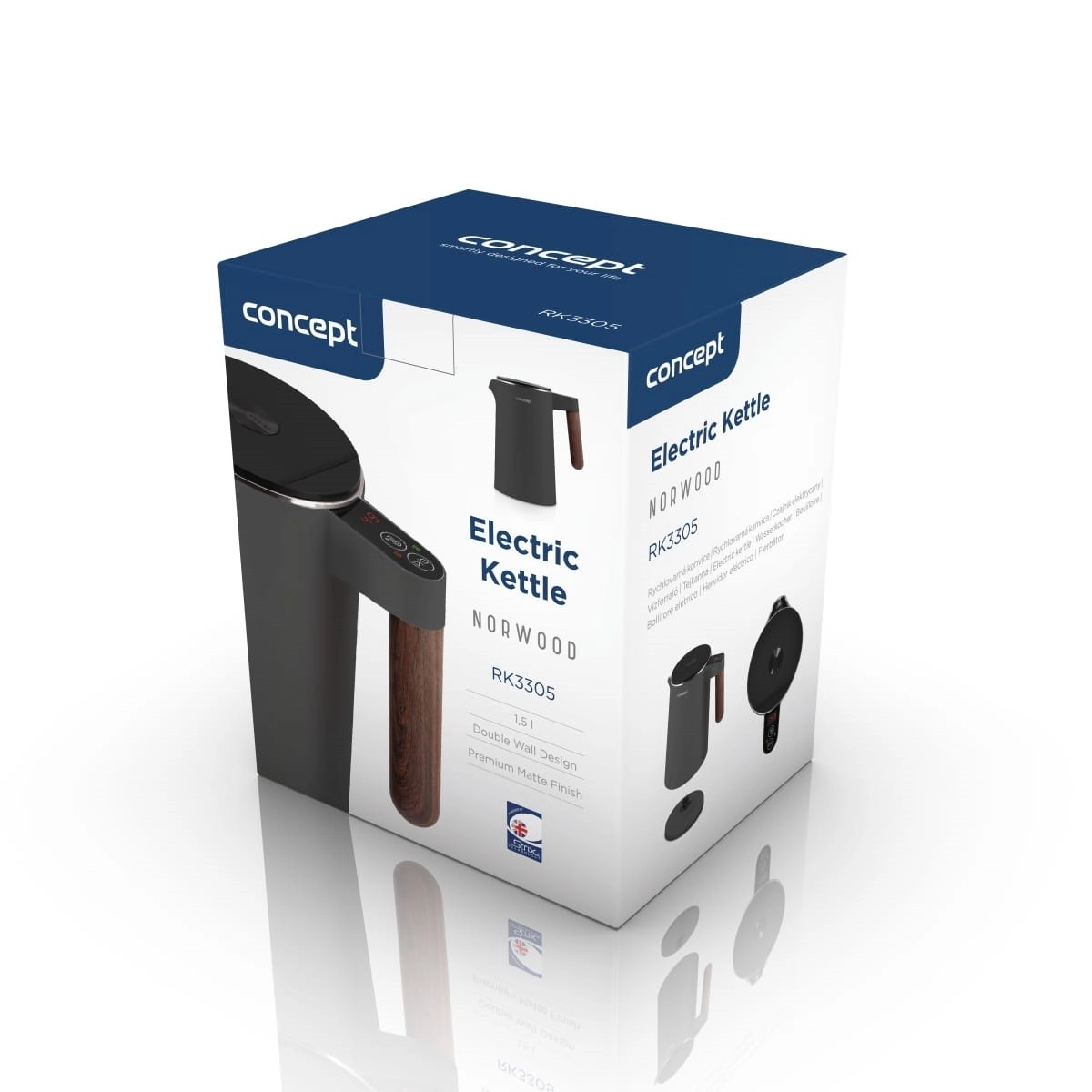 La bouilloire Concept RK3305 Norwood séduit par sa finition mate gris foncé et son élégant décor bois sur la poignée, s’intégrant parfaitement dans une cuisine moderne. Sa capacité de 1,5 litre est idéale pour la préparation quotidienne de thés, cafés et aliments pour bébé.