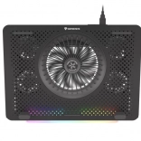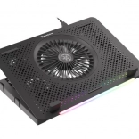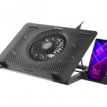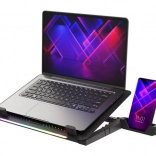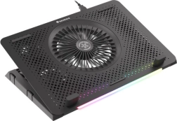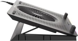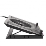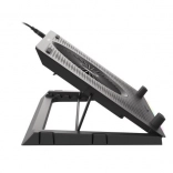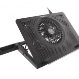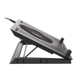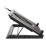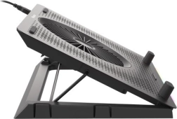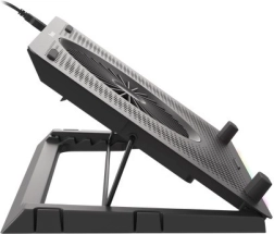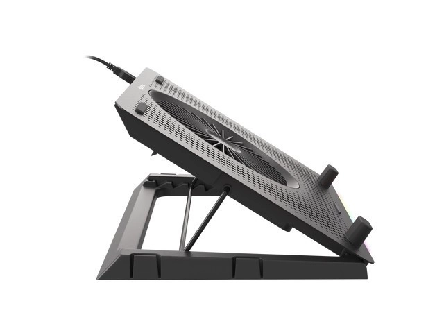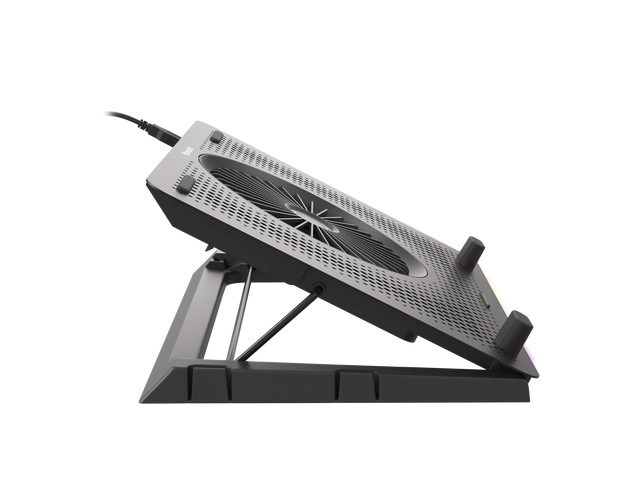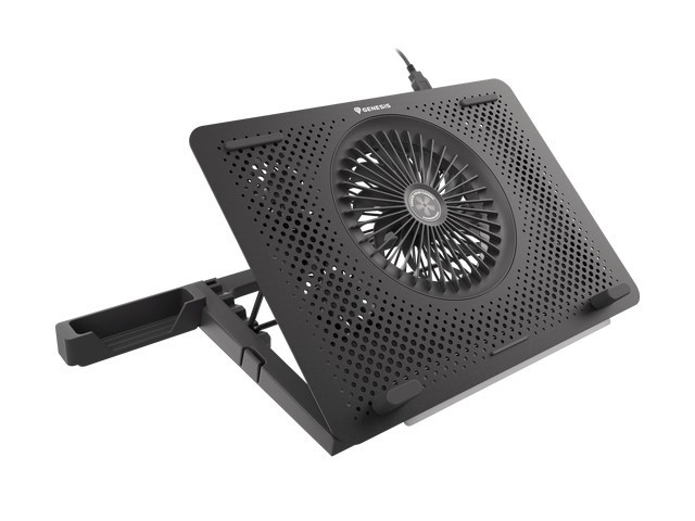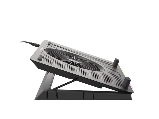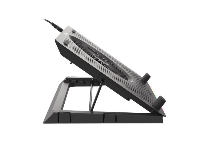 Le système de refroidissement se compose d’un grand ventilateur pour l’admission d’air frais et de quatre petits ventilateurs pour une évacuation efficace de la chaleur. Grâce au contrôle bi-niveau de la vitesse, vous adaptez facilement la performance au travail ou au jeu en cours. Les 5 niveaux d’inclinaison améliorent l’ergonomie et le confort, tandis que les butées et pieds en caoutchouc maintiennent l’ordinateur portable bien en place.