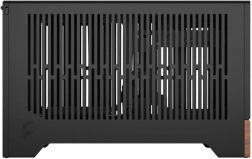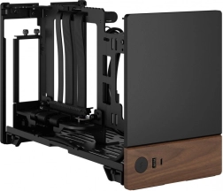 Boîtier d'ordinateur moderne et stylé qui combine l'élégance du métal noir avec l'apparence naturelle du bois, offrant des conditions idéales pour un refroidissement efficace et une gestion discrète des câbles.