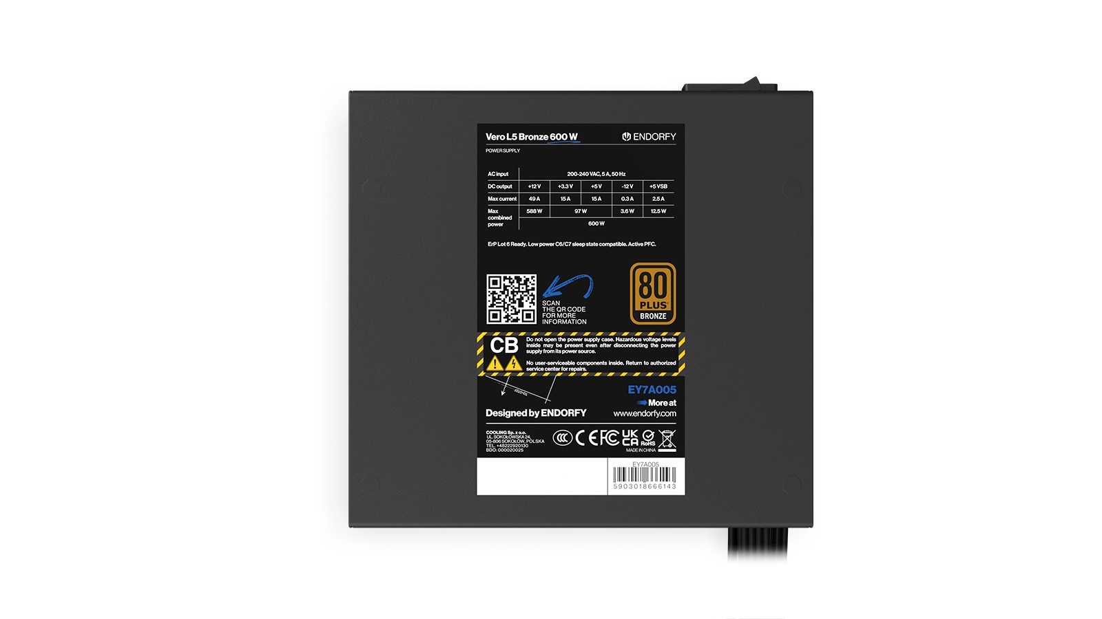 ENDORFY Vero L5 Bronze 600 W est un choix sûr pour les PC modernes. Grâce à la conversion DC-DC, elle maintient des tensions stables même sous charge variable et délivre 600 W constants pour les cartes graphiques gaming, les processeurs multicœurs et les stations de travail exigeantes. La certification 80 PLUS Bronze signifie un meilleur rendement, moins de pertes et un fonctionnement plus silencieux.