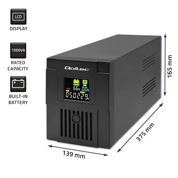 L’onduleur de secours UPS Qoltec série Monolith assure une alimentation stable pour votre ordinateur et vos équipements électroniques en cas de coupures ou de fluctuations du réseau. Grâce à sa puissance de 900 W (1500 VA), à son écran LCD clair, à la fonction AVR et à la gestion USB, vous sauvegarderez vos données en toute sécurité et protégerez vos appareils contre les surtensions, les sous-tensions et les surcharges.
