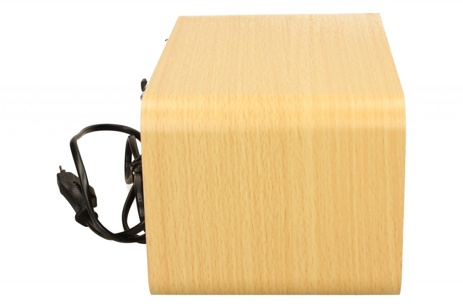 Le corps en bois favorise un rendu plus chaleureux des voix et de la musique, tandis que l’alimentation secteur assure une écoute stable sans changer de piles.