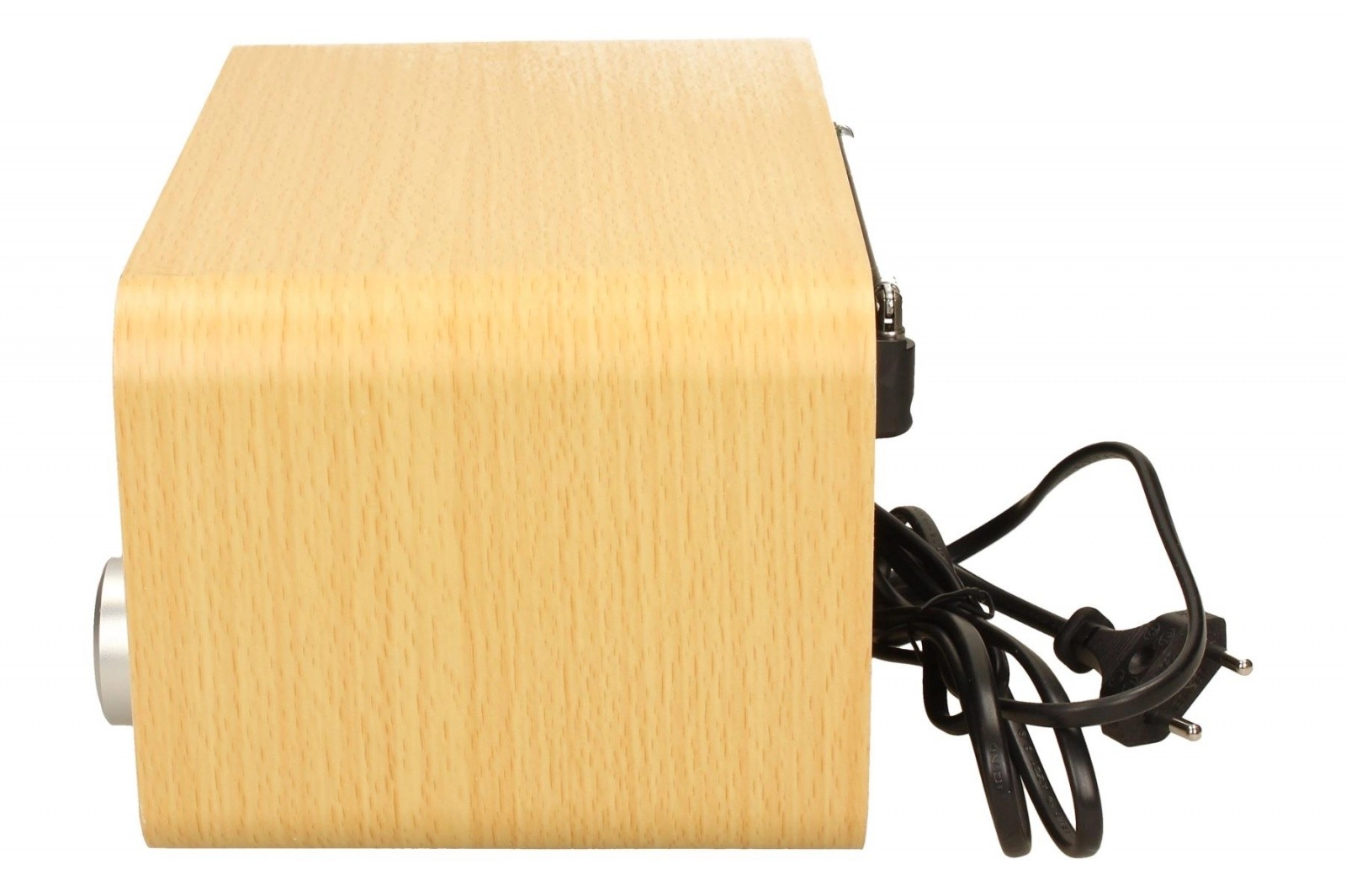 La radio couvre les bandes FM/MW et séduit par une réception stable et une antenne sensible. Le coffret en bois n’est pas seulement esthétique, il favorise également une meilleure acoustique. L’alimentation secteur garantit un fonctionnement fiable sans souci de piles.