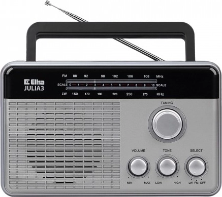 Radio de table compact Julia 3 en finition argentée offrant une grande échelle lisible, un accord pratique et un réglage fin du volume. Vous apprécierez également la réglage de la tonalité, l’antenne télescopique orientable, la sortie casque et la alimentation double sur secteur et piles.