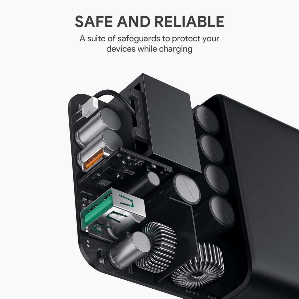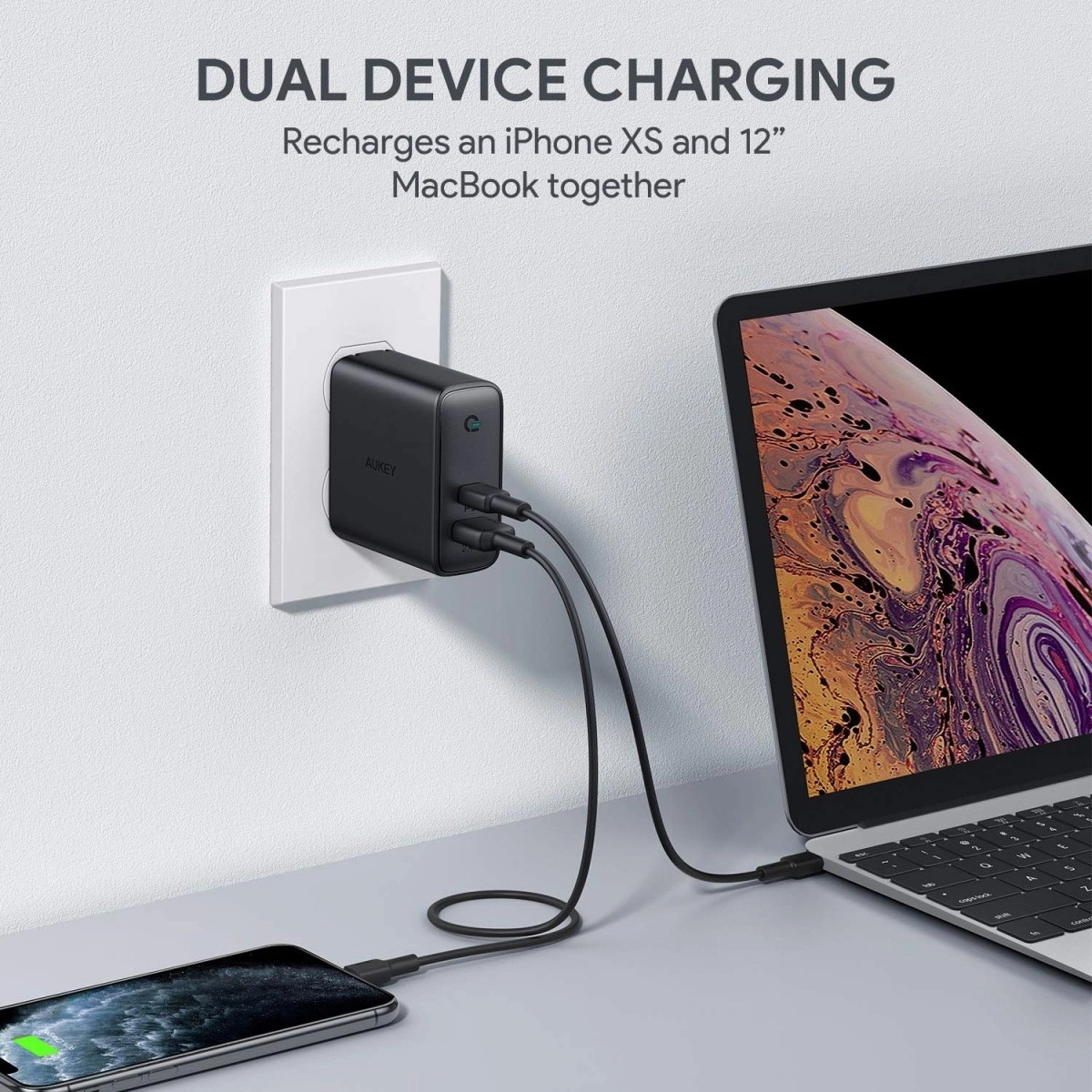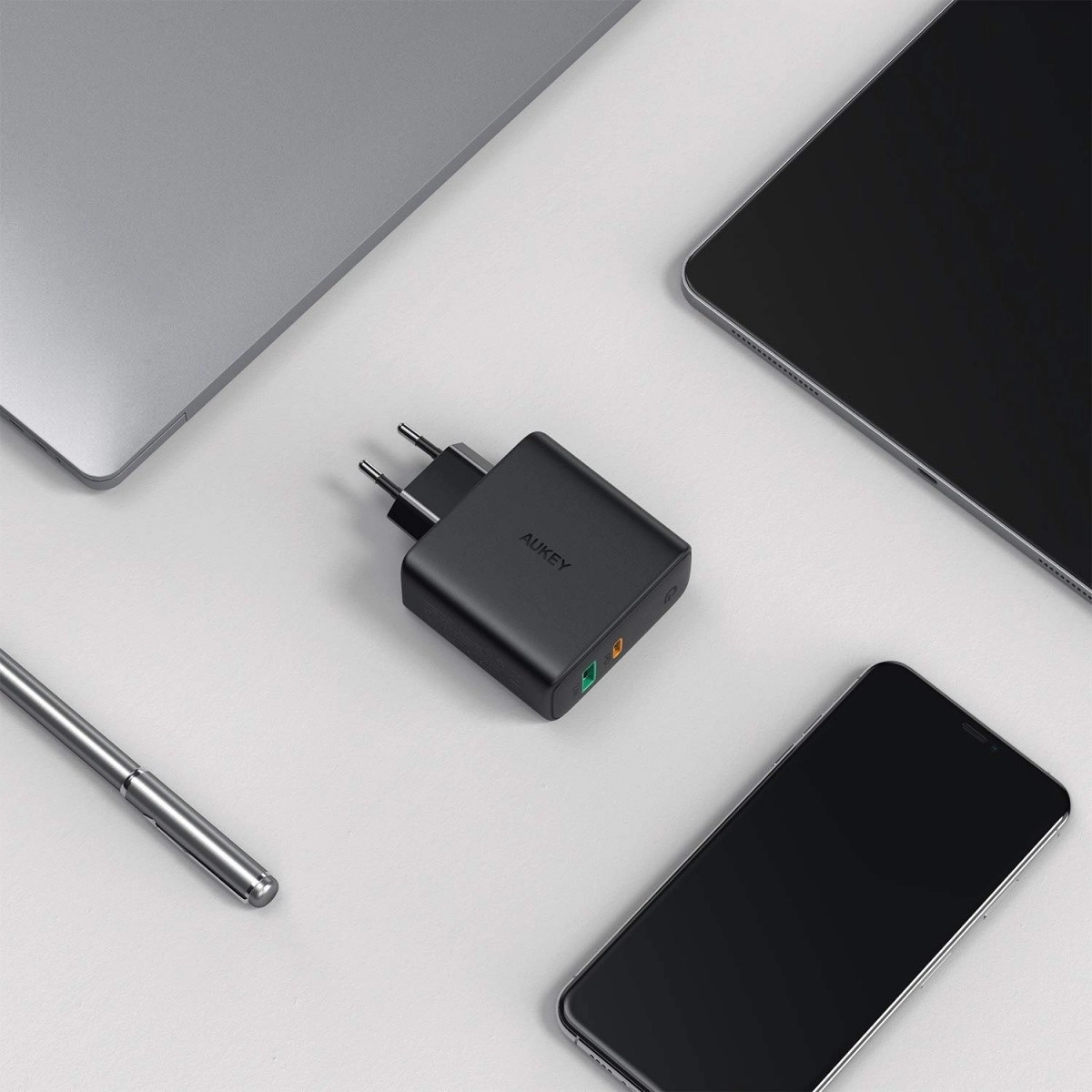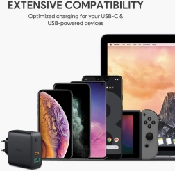 Rechargez rapidement et efficacement vos appareils avec le chargeur AUKEY PA-D3. Deux ports – USB-C Power Delivery et USB-A – couvrent tout, des téléphones et écouteurs jusqu’aux appareils plus exigeants, y compris les ordinateurs portables et moniteurs alimentés via USB-C. La technologie Dynamic Detect attribue intelligemment la puissance : avec un seul appareil connecté, jusqu’à 60 W ; avec deux appareils, elle optimise la répartition (par ex. jusqu’à 45 W pour le port principal), garantissant ainsi une charge rapide et sûre.